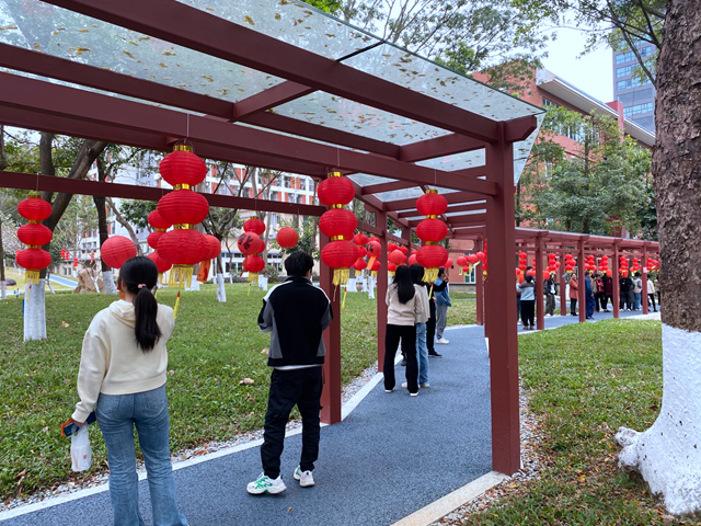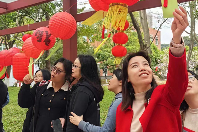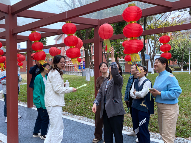 活動現(xiàn)場,各式燈籠裝飾點綴著整個花園長廊,滿是熱鬧喜慶的歡樂氛圍。燈籠下的謎底既貼近生活,又潛藏著民俗文化和歷史地理的知識,讓猜謎的過程趣味盎然、寓教于樂,參與的職工及學生或獨立思考,或發(fā)揚團隊合作精神,在展現(xiàn)各自才華的同時,領略了傳統(tǒng)文化的魅力和韻味。