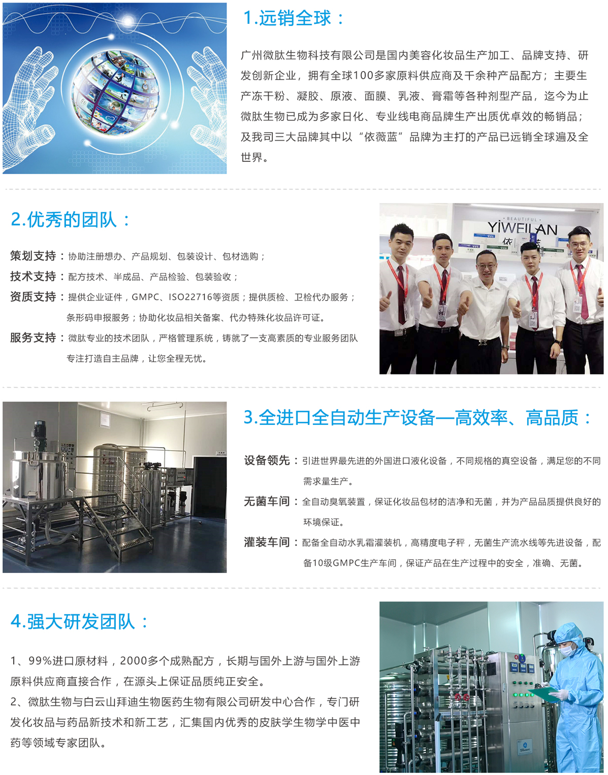 是護(hù)膚類產(chǎn)品、面膜類產(chǎn)品、身體類產(chǎn)品、微商化妝品加工、OEM化妝品加工,ODM化妝品加工,網(wǎng)購化妝品加工等產(chǎn)品專業(yè)生產(chǎn)加工的公司,擁有完整、科學(xué)的質(zhì)量管理體系,是集化妝品研制開發(fā)、生產(chǎn)制造、技術(shù)服務(wù)、OEM/ODM品牌加工四位一體化的專業(yè)工廠,2016年微肽生物更是通過了歐盟ISO22716和美國GMPC雙重認(rèn)證。工廠坐落在環(huán)境幽雅、交通便捷、物流發(fā)達(dá)的白云區(qū)石井街大朗十五社工業(yè)區(qū)。
