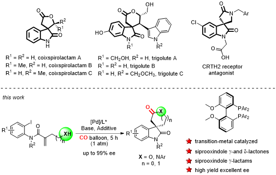 實現(xiàn)了鈀催化的不對稱Heck/羰基環(huán)化反應(yīng),發(fā)展了合成手性季碳氧化吲哚螺內(nèi)酯/內(nèi)酰胺的通用方法(2019,Angew.Chem.Int.Ed.)。