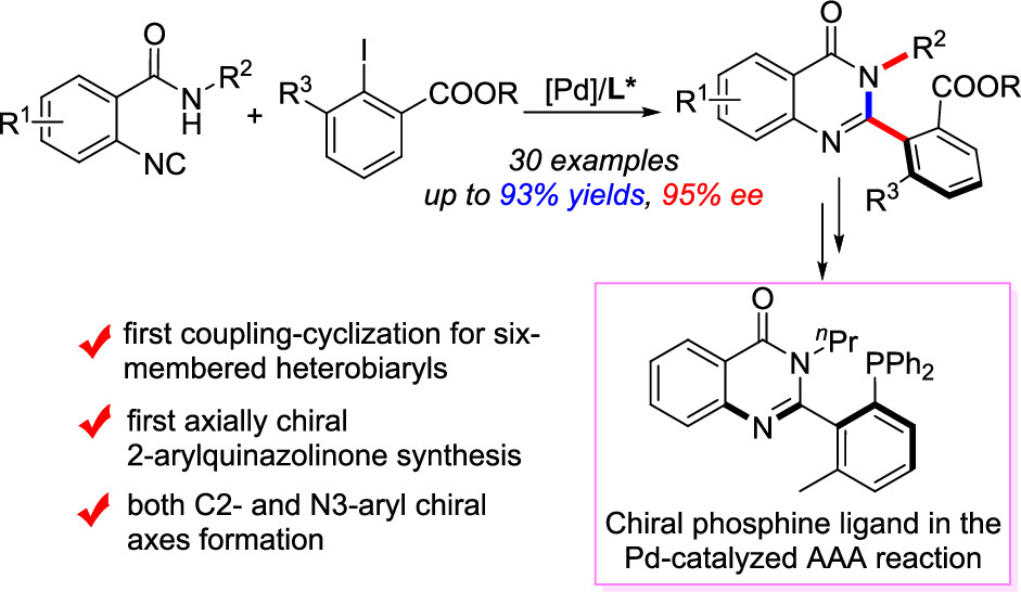 實(shí)現(xiàn)了鈀催化的官能化異腈的不對(duì)稱亞胺基環(huán)化反應(yīng),拓展了合成軸手性聯(lián)芳基化合物的新策略(2021,J.Am.Chem.Soc.)。