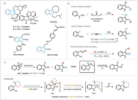 該研究開發(fā)了一種新型的2,3-二烷基吲哚區(qū)域選擇性合成方法,通過巧妙設(shè)計芳基乙烯取代異腈作為起始原料,在Pd-H催化體系下實現(xiàn)了精準(zhǔn)的2,3-二烷基吲哚構(gòu)建。該研究提出了一種全新的催化策略:利用Pd-H催化劑,通過異腈與烯烴的順序插入形成烷基鈀中間體INT-1,并在富電子雙膦配體的作用下促使亞烷基鈀發(fā)生1,2-遷移,最終經(jīng)過質(zhì)子解離和去質(zhì)子化形成相應(yīng)的2,3-二烷基吲哚。該方法優(yōu)勢顯著,具有高區(qū)域選擇性,僅生成目標(biāo)產(chǎn)物,未見其它區(qū)域異構(gòu)體;具有優(yōu)異的底物適應(yīng)性,適用于多種鏈狀和環(huán)狀烯基取代芳基異腈;具有良好的產(chǎn)率,收率達(dá)到20-98%,克級制備時仍保持75%的高收率;具有廣泛的應(yīng)用潛力,可實現(xiàn)色氨酸類似物、13C標(biāo)記吲哚及烷基環(huán)化吲哚的高效合成。通過同位素標(biāo)記實驗和密度泛函理論(DFT)計算,深入闡明了該反應(yīng)的機(jī)制,首次揭示了烷基鈀物種發(fā)生1,2遷移的獨特過程。這一發(fā)現(xiàn)不僅豐富了過渡金屬催化的反應(yīng)模式認(rèn)知,更為吲哚類化合物的后續(xù)修飾與應(yīng)用提供了強(qiáng)有力的技術(shù)支撐。相關(guān)成果于2025年4月7日發(fā)表在Angew. Chem. Int. Ed.。