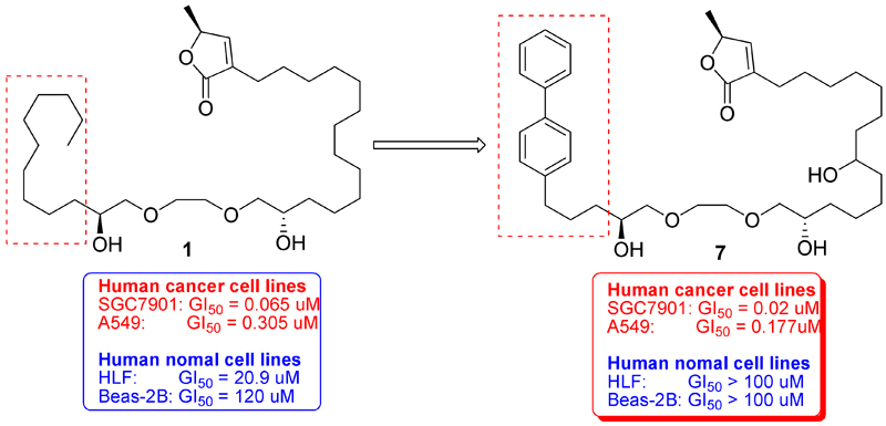 廣州生物院蔣晟研究員、南京大學(xué)姚祝軍教授和北京動(dòng)物所周光飚研究員通過(guò)合理藥物設(shè)計(jì),以廉價(jià)易得的乙二醇以及系列炔烴等為起始原料,首次構(gòu)建了系列具有構(gòu)象限制的乙二醇醚簡(jiǎn)化番荔枝內(nèi)酯天然產(chǎn)物,其中具有聯(lián)苯基修飾的化合物7能有效抑制SGC7901腫瘤細(xì)胞的增長(zhǎng)(GI50 = 20 nM),且具有更好的選擇性。