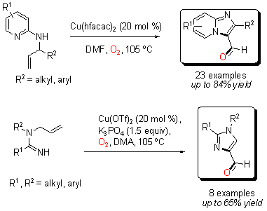 這一發(fā)現(xiàn)具有重要的學(xué)術(shù)價(jià)值:首先,該反應(yīng)在構(gòu)建雜環(huán)骨架的同時(shí),利用氧氣來源在雜環(huán)骨架上引入一個(gè)十分重要的官能團(tuán)---醛基; 其次,該反應(yīng)使用廉價(jià)低毒的銅催化劑、清潔的氧氣為氧化劑,反應(yīng)條件溫和;此外,該反應(yīng)具有很高的成鍵效率和氧化效率,從簡(jiǎn)單易得的原料,一步得到醛基取代的芳雜環(huán)結(jié)構(gòu)。這一發(fā)現(xiàn)還有廣泛的應(yīng)用前景,使用該方法為關(guān)鍵步驟,可以高效地合成神經(jīng)系統(tǒng)用藥奈可吡旦Necopidem,總收率從以往的21%提高到50%。