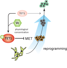 DNA的甲基化是調(diào)控我們?nèi)祟惣?xì)胞命運(yùn)的一個(gè)關(guān)鍵開(kāi)關(guān),近年來(lái)發(fā)現(xiàn)的Tet蛋白就是參與調(diào)控這一開(kāi)關(guān)的一種十分重要的表觀遺傳修飾酶。多能干細(xì)胞相對(duì)于體細(xì)胞處于DNA低甲基化狀態(tài),此前有報(bào)道稱Tet蛋白有促進(jìn)體細(xì)胞重編程的作用。然而,廣州生物院和上海生化細(xì)胞所的研究人員采用Tet1基因敲除的小鼠細(xì)胞模型進(jìn)行研究,卻發(fā)現(xiàn)了Tet1對(duì)體細(xì)胞重編程的抑制作用。進(jìn)一步研究發(fā)現(xiàn),通過(guò)調(diào)節(jié)細(xì)胞培養(yǎng)條件中的維生素C濃度,可以實(shí)現(xiàn)Tet1在促進(jìn)和抑制角色之間的轉(zhuǎn)換:在存在生理濃度維生素C的情況下,Tet1會(huì)顯著抑制體細(xì)胞重編程過(guò)程中一個(gè)早期必需的生物學(xué)過(guò)程——間充質(zhì)-上皮轉(zhuǎn)化(MET),從而阻礙體細(xì)胞重編程;而在維生素C濃度遠(yuǎn)低于生理濃度的情況下,Tet1的這一作用則會(huì)被隱藏起來(lái)。