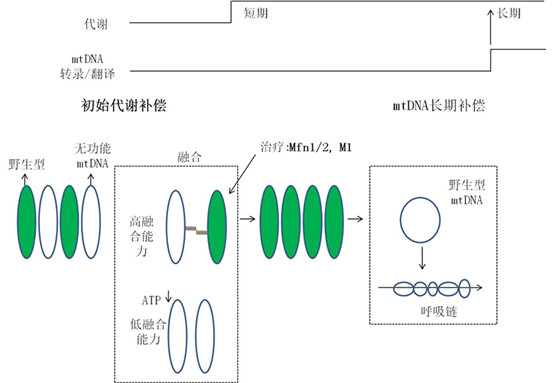 劉興國研究組建立了新的細胞模型,并應(yīng)用新的成像學方法,發(fā)現(xiàn)當線粒體的DNA喪失功能時,它們之間的同源融合能力很低,但是與正常線粒體保持了很高的異源融合能力從而在短時間內(nèi)獲得代謝功能的補償,稱為“初始代謝補償”。本研究揭示了線粒體疾病中“閾值效應(yīng)”的線粒體功能互補之謎:首先是短時的“初始代謝補償”,其次是長時的依賴于正常線粒體DNA表達的補償。更重要的是,研究組以“初始代謝補償”為線粒體疾病的新的治療靶點,篩選到了新的候選基因藥物及小分子藥物。