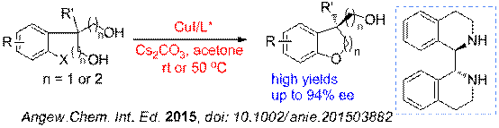 近期,課題組采用CuI/手性環(huán)狀二胺催化體系,成功地克服了鈀催化體系中的一些缺點,以高光學(xué)選擇性、高收率實現(xiàn)了不對稱去對稱化芳基C-O偶聯(lián)反應(yīng)構(gòu)建手性苯并2,3-二氫呋喃、苯并二氫吡喃結(jié)構(gòu)。并且通過這一催化體系,可以高光學(xué)選擇性地構(gòu)建全碳四級手性中心。