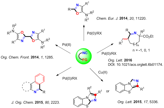 雜環(huán)化合物,尤其是含氮雜環(huán)化合物在現(xiàn)代藥物研發(fā)中具有至關(guān)重要的作用,發(fā)展高效的含氮雜環(huán)的構(gòu)建方法也吸引了越來越多的關(guān)注。隨著近年來過渡金屬催化反應(yīng)的發(fā)展,由過渡金屬催化(特別是鈀催化)的異腈插入反應(yīng)也得到了迅速的發(fā)展。這類插入反應(yīng)也被廣泛地應(yīng)用于含氮雜環(huán)的合成當(dāng)中。但是,在以往的大多數(shù)報道中,異腈同一氧化碳一樣,僅僅作為一種C1合成子來應(yīng)用,即只有異腈的末端碳參與了雜環(huán)的構(gòu)建。
