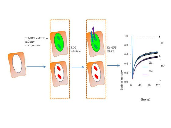 研究團(tuán)隊(duì)開發(fā)了活細(xì)胞內(nèi)實(shí)時(shí)精確定量常染色質(zhì)和異染色質(zhì)的松散性的成像方法,通過紅色熒光(HP1a-mCherry)用于區(qū)分常異染色質(zhì),綠色熒光(H1-GFP)的FRAP用于定量外周組蛋白的活躍程度,從而分別定量分析常異染色質(zhì)的松散性。我們將這一成像方法實(shí)時(shí)應(yīng)用于體細(xì)胞重編程中,發(fā)現(xiàn)在體細(xì)胞重編程早期,只有異染色質(zhì)顯著變松散,常染色質(zhì)沒有明顯變化。?