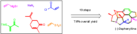 該研究成果的亮點(diǎn)在于以價廉易得的天然手性源(S)-Carvone為起始原料,運(yùn)用簡單的合成砌塊,以極好的立體選擇性,簡潔、高效地實(shí)現(xiàn)了(-)-Daphenylline的全合成。關(guān)鍵步驟包括Mg(ClO4)2催化的酰胺環(huán)化, Diels?Alder 環(huán)加成反應(yīng),Robinson環(huán)化/芳構(gòu)化,Friedel–Crafts環(huán)化。該成果發(fā)表在Angew. Chem. Int. Ed.上(DOI: 10.1002/anie.201902268)。