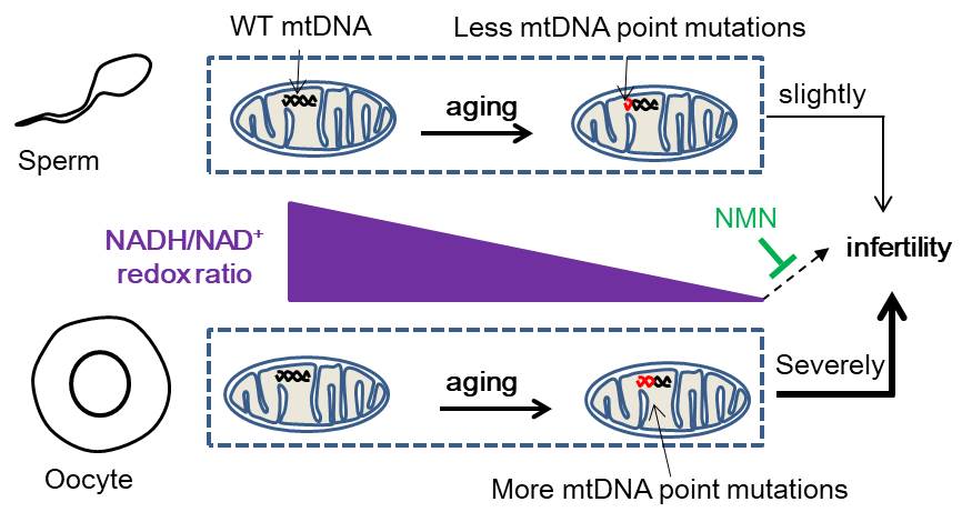 老齡生育不但是生殖與再生醫(yī)學領(lǐng)域的基本科學問題,而且是當今我國國情的重大國家需求。衰老是影響男性和女性生育能力的關(guān)鍵因素之一,其中女性生育力通常在30歲后下降。另一方面,快速的環(huán)境變化也可能導致近年來不育率急劇上升。線粒體作為細胞內(nèi)含有DNA的能量工廠,其功能障礙被假設(shè)在年齡和環(huán)境導致的不育中起重要作用。然而,衰老積累的線粒體DNA突變是否以及如何調(diào)節(jié)生育力及其性別依賴性仍然未知。