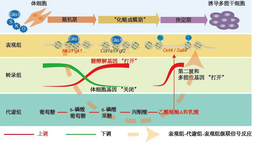 科研人員生動地將跨界級聯(lián)反應(yīng)比喻為“蝴蝶效應(yīng)”:轉(zhuǎn)錄因子Glis1猶如蝶戀花的微風(fēng),引發(fā)全基因組水平多能性的龍卷風(fēng),這一蝴蝶效應(yīng),并非單單依靠基因組水平可以完成,需要“他山之石”——代謝水平跨界來連接,形成“表觀組-代謝組-表觀組”的級聯(lián)反應(yīng)三部曲。這一跨界級聯(lián)反應(yīng),正如蝴蝶效應(yīng)中微風(fēng)變颶風(fēng)需要千里的混沌條件,又如那青花瓷的美麗在純青爐火中需要渺渺煙雨共同塑就。體細胞要返老還童,回到精卵“一如初見”的多能性狀態(tài),需要代謝這一跨界伏筆。