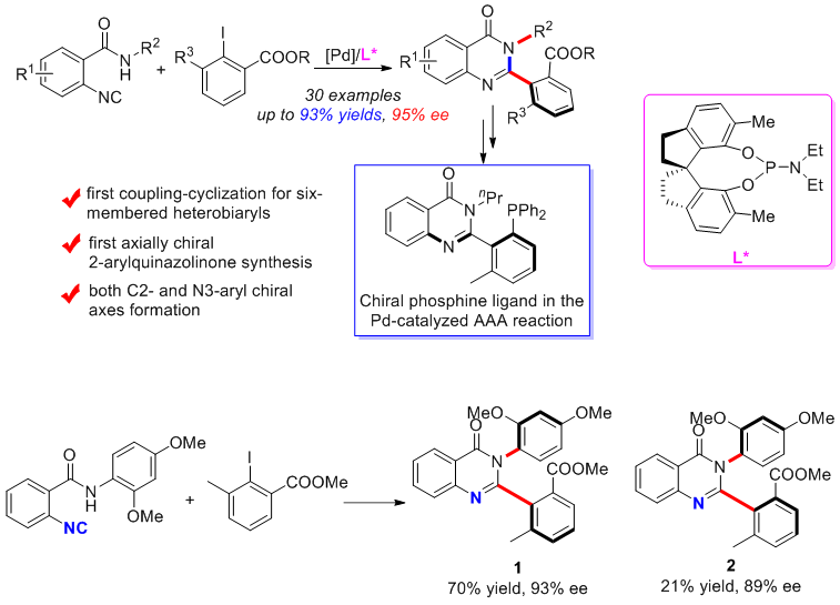 在該反應(yīng)中,N-烷基-2-異腈基苯甲酰胺和2,6-二取代的碘苯化合物在鈀催化的條件下能夠以高收率和高對(duì)映選擇性的合成軸手性2-芳基喹唑啉酮。這一反應(yīng)的創(chuàng)新點(diǎn)主要體現(xiàn)在以下四個(gè)方面:1)拓展了合成軸手性聯(lián)芳基化合物的第4條策略,即在構(gòu)建二芳基軸的同時(shí)環(huán)化芳構(gòu)化,實(shí)現(xiàn)了兩個(gè)不同的六員環(huán)的軸手性聯(lián)芳基化合物的合成;2)首次實(shí)現(xiàn)了軸手性的2-芳基喹唑啉酮的合成,以往的合成都是集中在3位N-芳基手性軸的構(gòu)建。DFT計(jì)算表明所合成的化合物旋阻能壘ΔG>32 Kcal/mol,熱穩(wěn)定實(shí)驗(yàn)表明,其中一個(gè)化合物的甲苯溶液加熱到110 oC,12個(gè)小時(shí)以后沒(méi)有觀測(cè)到消旋;3)當(dāng)用N-(2,4-二甲氧基苯基)-2-異腈基苯甲酰胺作為官能化異腈底物時(shí),能夠以中等的非對(duì)映選擇性和優(yōu)秀的對(duì)映選擇性獲得同時(shí)包含兩個(gè)手性軸的2,3-二芳基喹唑啉酮化合物。為相鄰兩根手性軸的同時(shí)構(gòu)建提供了新的思路;4)合成的軸手性的2-芳基喹唑啉酮可以成功轉(zhuǎn)化成結(jié)構(gòu)獨(dú)特的N,P配體,在初步的鈀催化的不對(duì)稱烯丙基烷基化(AAA)中表現(xiàn)出良好的不對(duì)稱誘導(dǎo)效果。