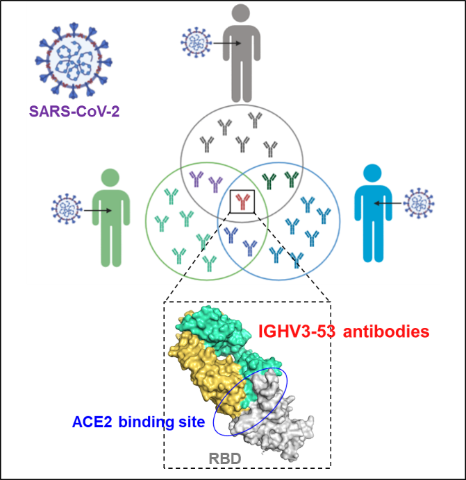 新冠病毒感染后,IGHV3-53編碼的共享抗體能快速產(chǎn)生并特異性識別新冠病毒S蛋白RBD區(qū)域的ACE2受體結(jié)合位點(diǎn)