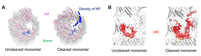 本研究首先在致病性腸炎弧菌中發(fā)現(xiàn)了一個能夠自水解的T6SS效應(yīng)蛋白RhsP,進(jìn)一步通過生化實(shí)驗(yàn)發(fā)現(xiàn)RhsP自水解為三個片段,N端、 Rhs桶和具有核酸酶毒性的C端(圖1A)。為了解答自水解這一過程對RhsP的分泌和核酸酶毒素釋放的作用,團(tuán)隊(duì)利用單顆粒冷凍電鏡技術(shù)獲得了RhsP自水解后(cleaved RhsP)和RhsP自水解前(Uncleaved RhsP)的高分辨結(jié)構(gòu)(圖1B)。對自水解前后的RhsP的高分辨結(jié)構(gòu)分析后發(fā)現(xiàn),Rhs區(qū)域形成了一個封閉的桶狀結(jié)構(gòu)。N端肽段從桶蓋頂部縫隙延伸出去,提示N端水解后的離開軌跡(圖2A)。另外,發(fā)生水解后的VIR在構(gòu)象上發(fā)生了巨大變化,它以U形在桶內(nèi)伸展并將含有核酸酶毒素的VIR-C端送出到桶蓋上移引起的缺口處(圖2B)。最后,通過結(jié)構(gòu)分析發(fā)現(xiàn)VIR結(jié)合β-sheet的疏水內(nèi)表面,通過構(gòu)建VIR-C端F1208A/Y1209A突變株驗(yàn)證了RhsP自水解后引發(fā)VIR構(gòu)象變化促進(jìn)二聚體的形成。