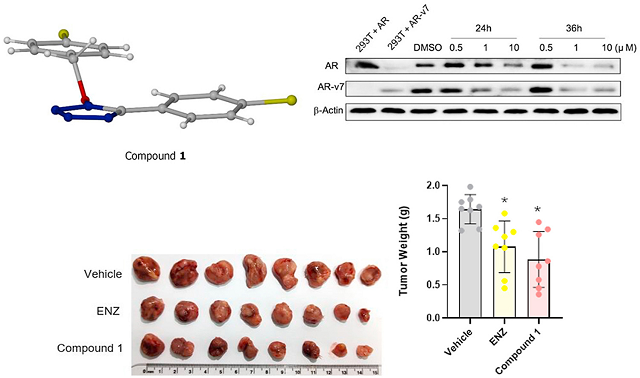 圖注:先導(dǎo)化合物Compound 1的結(jié)構(gòu)(左上);先導(dǎo)化合物Compound 1抑制22Rv1細(xì)胞AR和AR-V7的蛋白表達(dá)(右上);先導(dǎo)化合物Compound 1抑制22Rv1異種移植的去勢(shì)抵抗性前列腺癌小鼠腫瘤生長(zhǎng)(下)
