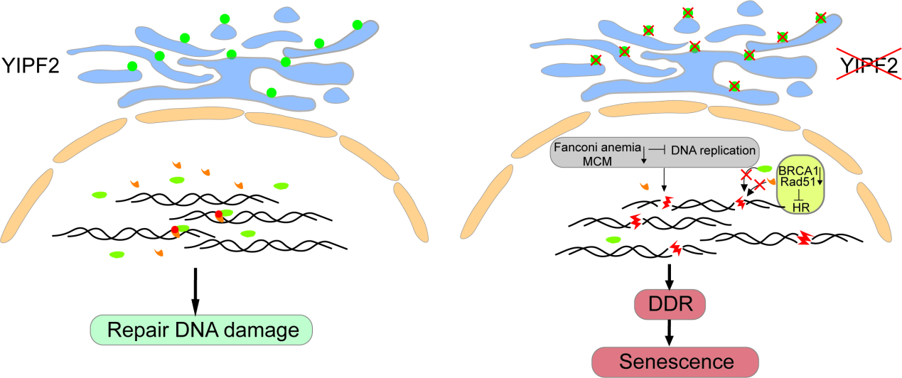 研究團隊應用siRNA文庫進行了全基因組范圍篩選,發(fā)現了一些尚未報道的維持基因組穩(wěn)定性的蛋白,高爾基體結構蛋白YIPF2是其中之一。YIPF2缺失會引起DNA雙鏈斷裂和胞質中雙鏈DNA片段增多。進一步研究發(fā)現,YIPF2促進BRCA1及Rad51等核心蛋白介導的同源重組修復(HR),減少雙鏈斷裂DSB的形成。YIPF2蛋白還調控了與DNA復制密切相關的MCM家族蛋白及范科尼貧血蛋白(Fanconi anemia)從而影響DNA的復制進程。這些結果說明YIPF2通過對這兩個過程的調控促進DNA損傷修復,從而參與基因組穩(wěn)定性維持。另外,在細胞中過表達YIPF2蛋白能夠有效促進DNA損傷修復,延緩DNA損傷誘導的細胞衰老。
