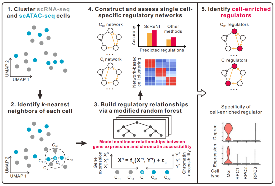 針對上述問題,研究團(tuán)隊提出了一種創(chuàng)新算法ScReNI,能夠在單細(xì)胞水平上整合scRNA-seq與scATAC-seq數(shù)據(jù),實現(xiàn)細(xì)胞特異性的調(diào)控網(wǎng)絡(luò)推斷。ScReNI的核心設(shè)計思路包括以下四個關(guān)鍵步驟(圖1):
