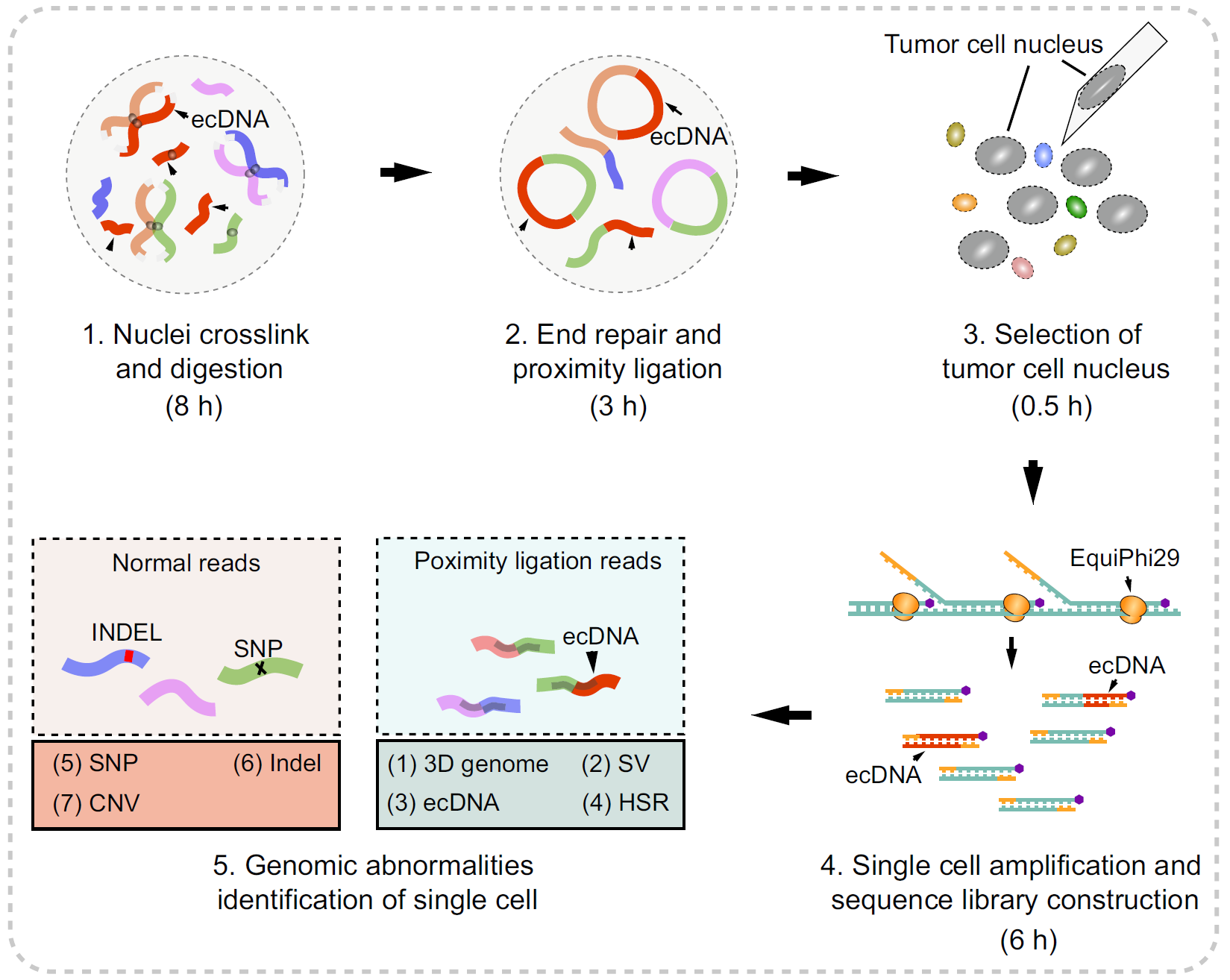 研究團(tuán)隊(duì)利用Uni-C技術(shù)對(duì)胰腺癌來源的CTCs進(jìn)行分析,僅整合7個(gè)細(xì)胞數(shù)據(jù),即可還原約89%的SNP/INDEL與75%的結(jié)構(gòu)變異,與腫瘤組織檢測(cè)結(jié)果高度一致,驗(yàn)證了該方法在稀有細(xì)胞中的準(zhǔn)確性與代表性。進(jìn)一步分析發(fā)現(xiàn),Uni-C可解析CTC中ecDNA的分子結(jié)構(gòu),以及處于細(xì)胞周期不同階段CTC所展現(xiàn)出的染色質(zhì)構(gòu)象差異,如A/B隔室重構(gòu)與高階結(jié)構(gòu)消失等,為評(píng)估CTC活性與細(xì)胞狀態(tài)提供了新維度。