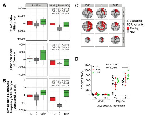 本研究結(jié)果發(fā)現(xiàn),預(yù)存瘧疾導(dǎo)致動物產(chǎn)生更多的CD4+ CCR5+ T細胞,有利于SIV的復(fù)制,從而導(dǎo)致更高的病毒載量。相反,隨后瘧疾感染誘導(dǎo)了更大比例的CD4+ CD28high CD95high中央記憶型T細胞和更強的SIV特異性T細胞反應(yīng),并維持SIV特異性T細胞受體庫的多樣性,產(chǎn)生新的SIV特異性T細胞克隆型來追蹤SIV的抗原變異,從而延長SIV感染動物的壽命。