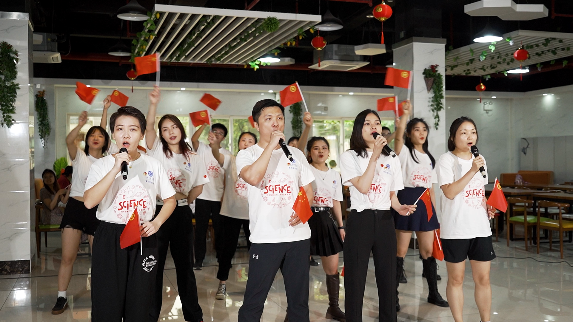 活動伊始,健康院食堂用餐的師生們正熱烈討論今天的食堂是不是有事發(fā)生。11:30,一首五月天的《倔強(qiáng)》旋律忽然從食堂東側(cè)響起,一經(jīng)十幾秒,正當(dāng)大家尋找音樂來源時,一名主唱從食堂西側(cè)人群中走出,《倔強(qiáng)》的歌聲開始冉冉升起,伴隨著四名主唱的匯聚,健康院食堂中洋溢著青春四射的悠揚(yáng)歌聲。主唱演員或面對周圍師生們,或互相對望,活力四射,鏗鏘有力的歌聲感染了現(xiàn)場師生們。用餐的師生們越聚越多,他們紛紛停下手中的餐具,緊接著在一名女領(lǐng)舞的帶領(lǐng)下,舞蹈團(tuán)隊的同學(xué)們上演了活力四射的《我們都是追夢人》和《奔跑的青春》的舞蹈串燒,現(xiàn)場人聲鼎沸,紛紛鼓掌,快閃活動持續(xù)走向高潮,更多的師生被吸引進(jìn)來。最后,舞蹈表演完畢,舞蹈與唱歌的同學(xué)變換位置,《我和我的祖國》的歌聲悠然響起,形成新高潮,整個活動愈發(fā)精彩,在一旁用餐的師生們們也揚(yáng)起了小紅旗和共青團(tuán)旗,隨著歌聲一起揮動。