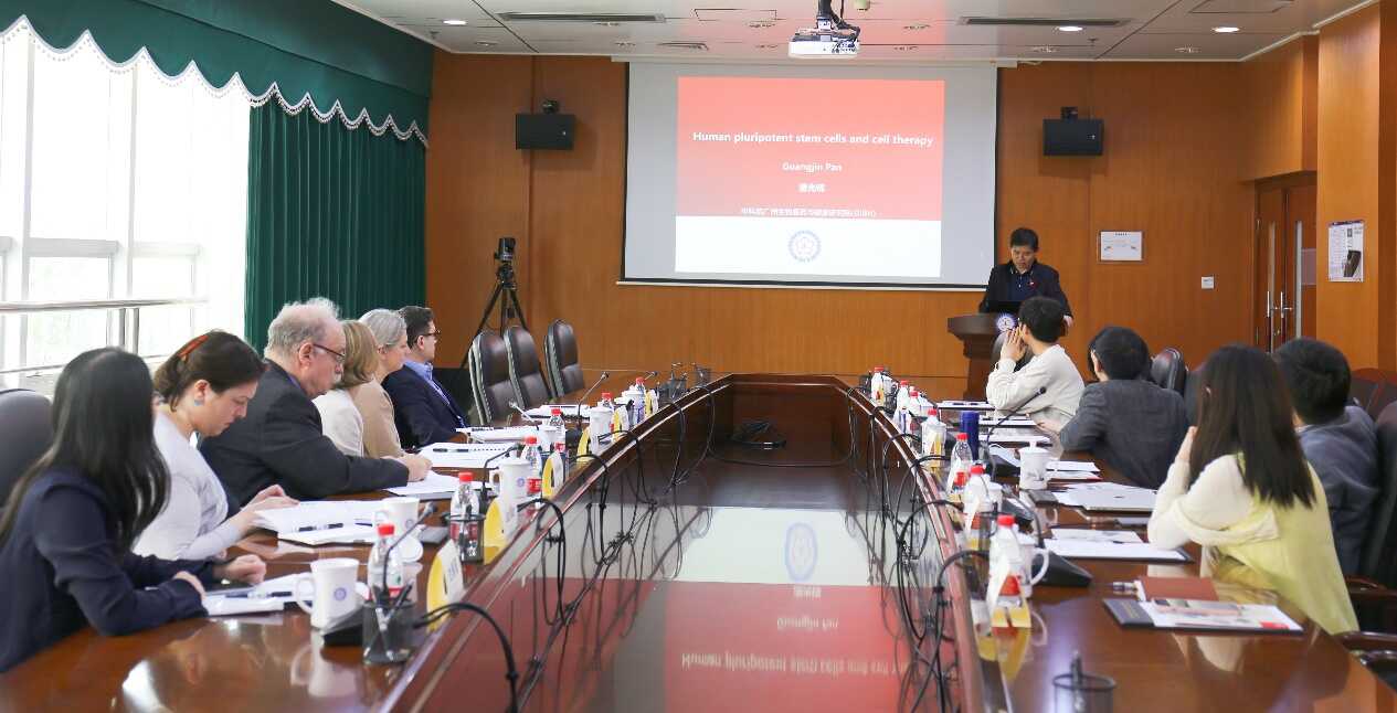 潘光錦對(duì)英國皇家學(xué)會(huì)代表團(tuán)表示熱烈歡迎,并向來賓介紹了廣州健康院的基本情況。在學(xué)術(shù)交流環(huán)節(jié),潘光錦研究員、李鵬研究員分別圍繞“人類多能干細(xì)胞與細(xì)胞治療”和“癌癥細(xì)胞免疫療法治療實(shí)體瘤”兩個(gè)話題做學(xué)術(shù)報(bào)告,分享了他們課題組在開發(fā)細(xì)胞治療藥物方面的進(jìn)展。Alison Noble教授以及Mark Walport爵士對(duì)他們研究?jī)?nèi)容表現(xiàn)出了極高的興趣,并對(duì)他們?nèi)〉玫某晒o予了高度的肯定。中英雙方與會(huì)人員就細(xì)胞藥物治療機(jī)制、研發(fā)難點(diǎn)等進(jìn)行了深入的學(xué)術(shù)探討。