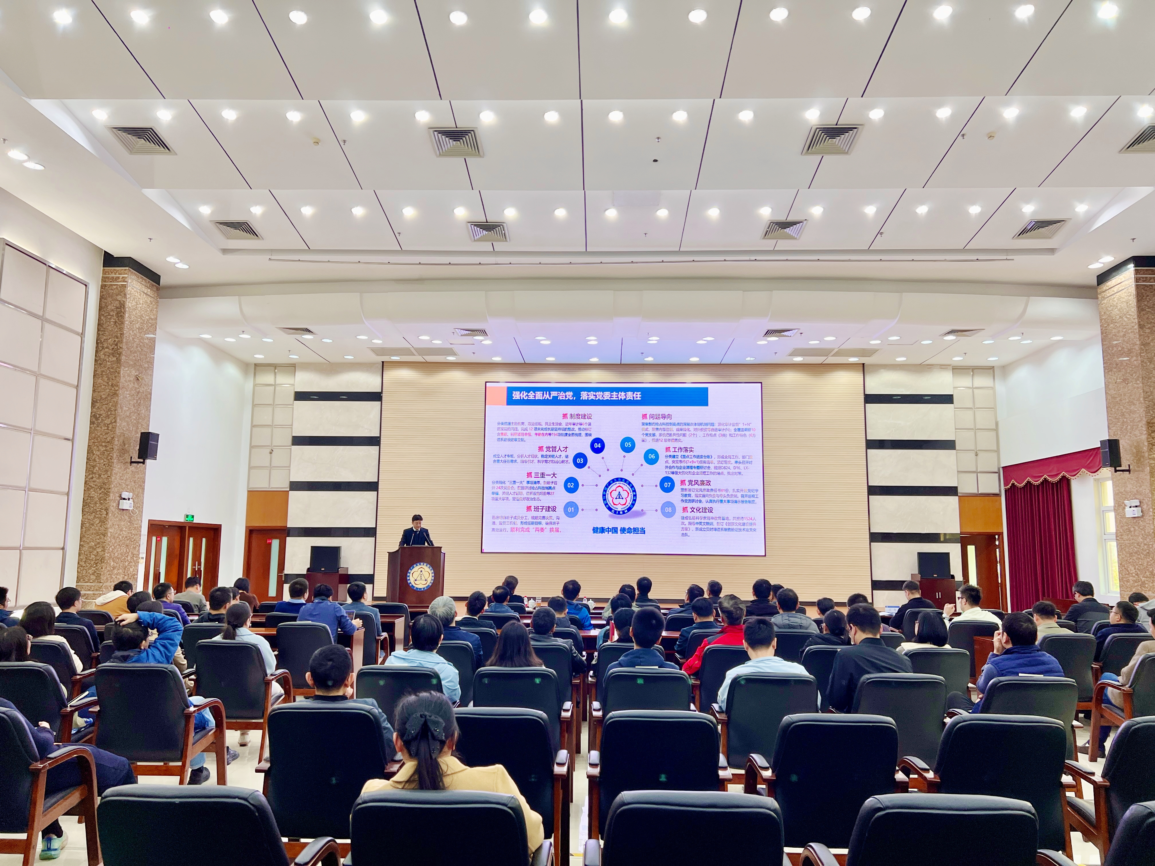 陳廣浩首先介紹了考核評議的要求和相關(guān)注意事項(xiàng)。隨后,孫飛副院長(主持工作)代表廣州健康院領(lǐng)導(dǎo)班子作年度工作總結(jié)報(bào)告。孫飛從“強(qiáng)化全面從嚴(yán)治黨,以高質(zhì)量黨建引領(lǐng)高水平科技創(chuàng)新”“進(jìn)一步全面深化改革創(chuàng)新,提升研究院治理能力”“爭取重大科技任務(wù),保障創(chuàng)新成果產(chǎn)出”“匯聚優(yōu)勢力量,加快建設(shè)細(xì)胞譜系設(shè)施”“促進(jìn)科教融合,切實(shí)提升研究生培養(yǎng)質(zhì)量”“務(wù)實(shí)開展交流合作,有效增強(qiáng)研究院國際影響力”等6個(gè)方面全面回顧了研究院2024年取得的成績,分析了存在的問題與不足,并對研究院2025年度重點(diǎn)工作進(jìn)行了部署。