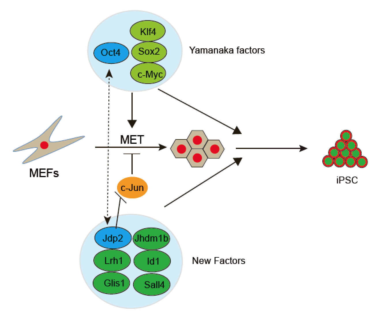 發(fā)現(xiàn)c-Jun拮抗因子可替代Oct4,找到自主知識產(chǎn)權(quán)的非yamanaka因子的全新重編程因子組合(2015,Nature Cell Biology)。