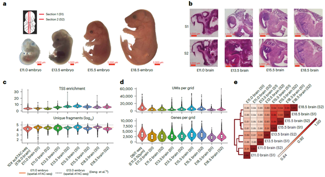 (圖2. E11.0, E13.5, E15.5 和E18.5小鼠腦的空間基因表達、染色質(zhì)可及性以及結(jié)合二者的空間圖譜)