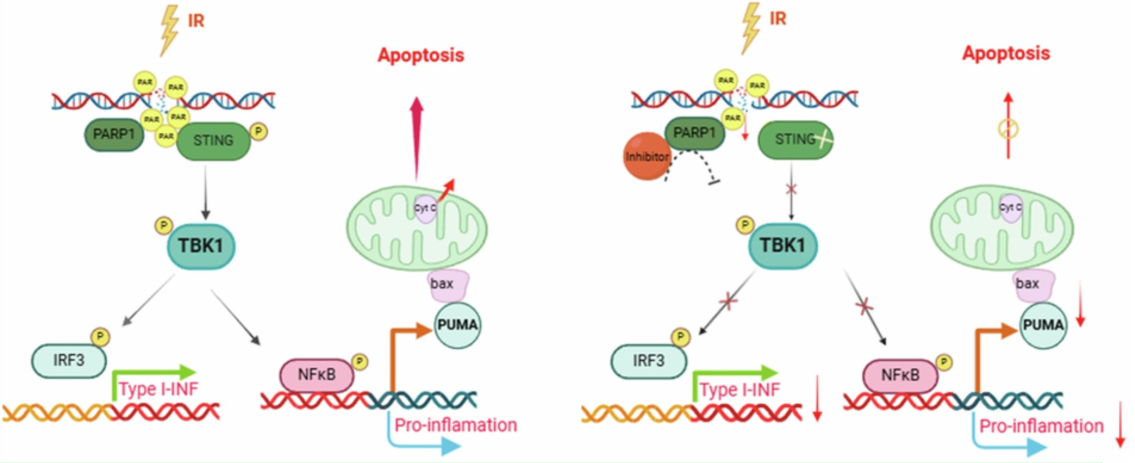 該研究揭示了STING(干擾素基因刺激因子)蛋白通過(guò)結(jié)合DNA損傷響應(yīng)蛋白PARP1合成的產(chǎn)物分子PAR(多聚二磷酸腺苷核糖),驅(qū)動(dòng)輻射后細(xì)胞死亡的關(guān)鍵機(jī)制。動(dòng)物實(shí)驗(yàn)表明,阻斷或抑制該通路可使小鼠腸道輻射損傷降低70%,生存率提升5倍。該研究為癌癥放療副作用防護(hù)和急性輻射損傷救治提供了全新策略。相關(guān)成果于2025年2月12日發(fā)表在Cell Death and Differentiation。