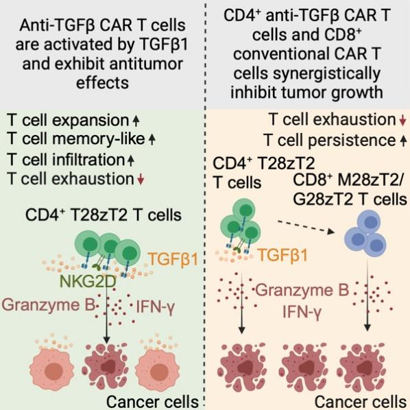 該研究首次證實CD4+靶向TGFβ的CAR-T細胞(T28zT2 T細胞)與CD8+靶向GPC3或MSLN的CAR-T細胞聯合應用具有協同抗腫瘤效應,為實體瘤免疫治療提供了全新策略,并同步啟動針對肝癌和胰腺癌等實體瘤的相關臨床研究。該療法有望突破目前實體瘤CAR-T細胞療法響應率低、復發(fā)率高的瓶頸,推動CAR-T細胞療法在實體瘤領域的臨床轉化。相關成果于2025年3月18日發(fā)表在Cell Reports Medicine。