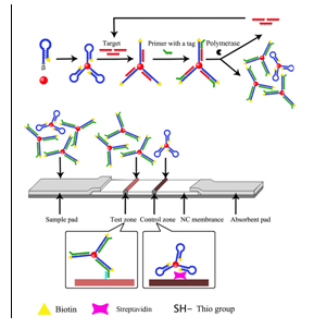 廣州生物院曾令文研究組成功開發(fā)出一種基于核酸等溫鏈置換反應(yīng)技術(shù)與膠體金技術(shù)的核酸檢測生物傳感器,該生物傳感具有以下三個特點:1.簡單快速,從核酸到檢測結(jié)果30分鐘完成,無需復(fù)雜的檢測儀器,僅需恒溫42度;2.高靈敏度,檢測最低限可達(dá)0.01fM;3.高特異性,可區(qū)分單堿基突變。該生物傳感器克服了傳統(tǒng)檢測方法的操作技術(shù)復(fù)雜、耗時長、需要特殊儀器等缺陷。