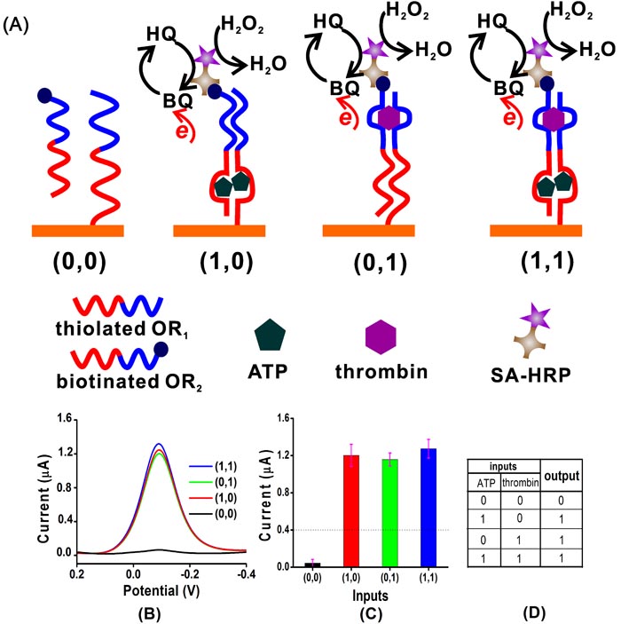 中科院廣州生物醫(yī)藥與健康研究院曾令文研究組模擬邏輯門運算機理,利用ATP和凝血酶為兩種輸入信號,電流輸出為檢測信號,成功構(gòu)建了系列的電子邏輯門用于小分子物質(zhì)(ATP)和蛋白質(zhì)(凝血酶)的智能化檢測。ATP是一種重要的能源物質(zhì),可以用來監(jiān)視細(xì)胞受損和死亡情況;凝血酶是血液凝固因子之一,常與動脈硬化以及一些心血管疾病密切相關(guān)。以這兩種物質(zhì)為研究對象,該課題研究構(gòu)建了四種邏輯門,分別是“AND”,“OR”,“NOR”和“NAND”。真值的判別標(biāo)準(zhǔn)是在輸入檢測物質(zhì)時,電流值大于0.4 mA為“1”,電流值小于0.4 mA為“0”。這些邏輯門具有很好的選擇性,能夠用于實際樣品中ATP和凝血酶的檢測,為智能化監(jiān)控細(xì)胞受損情況和心血管疾病提供了一種有效的手段。它們也可重復(fù)多次利用,有效地節(jié)約了成本,簡化了操作,在疾病診斷和生物監(jiān)測方面具有很高的利用價值。相關(guān)成果發(fā)表在Biosensors and Bioelectronics,42(2013),93-99上。