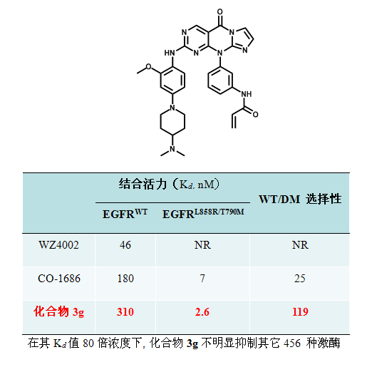 開發(fā)具有高特異性EGFR T790M突變體抑制劑已成為解決Gefitinib等藥物臨床耐藥的一個(gè)重要策略,但進(jìn)展緩慢。2009 年Nature雜志報(bào)道得第一個(gè)選擇性了EGFR T790M非可逆抑制劑WZ4002,但因?yàn)橹R產(chǎn)權(quán)糾紛無法進(jìn)一步開發(fā);2012年美國Clovis Oncology 公司才啟動(dòng)了其選擇性的EGFRT790M 突變體抑制劑CO-1686的I期臨床研究,但該化合物選擇性一般,僅為25倍(Kd(EGFRWT)/ Kd(EGFRL858R/T790M ) = 25)。