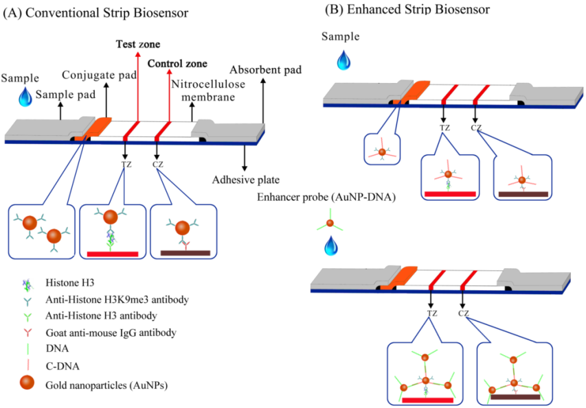 研究人員采用信號增強的試紙條生物傳感器用于組蛋白甲基化的檢測。有別于傳統(tǒng)的試紙條,這種新型的試紙條中引入了一個信號增強探針(AuNP-DNA),實現(xiàn)了對檢測信號的進一步放大。選擇HeLa細胞中的組蛋白H3K9三甲基化(me3)作為研究對象,在0.02ug的HeLa細胞組蛋白提取液中就能檢測到,比傳統(tǒng)的試紙條和western blot的靈敏度分別提高了10倍和15倍。該方法簡便快速,實驗結果在15分鐘內用肉眼就能觀察到,避免了western blot的操作步驟復雜,操作時間長等缺點。這個方法同樣適用于其他類型的組蛋白甲基化,乙?;揎椀龋哂衅毡檫m用性。