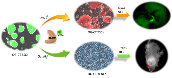 早期胚胎囊胚的組成包括胚胎干細(xì)胞(ESC)、滋養(yǎng)干層細(xì)胞(TSC)和原始內(nèi)胚層細(xì)胞(XEN)。賴良學(xué)課題組研究發(fā)現(xiàn),CRISPR介導(dǎo)的轉(zhuǎn)錄激活因子可有效啟動ESC的內(nèi)源基因Cdx2和Gata6基因的表達(dá)。Cdx2是TSC的標(biāo)記基因,Gata6是XEN的標(biāo)記基因,兩者均不在ESC中表達(dá)。通過進(jìn)一步誘導(dǎo)實(shí)驗(yàn)發(fā)現(xiàn),通過調(diào)控這兩個內(nèi)源性基因的表達(dá),ESC可分別被直接誘導(dǎo)為胚外細(xì)胞TSC和XEN。通過標(biāo)記基因檢測以及體內(nèi)外分化實(shí)驗(yàn)證實(shí)這些誘導(dǎo)細(xì)胞具是有完全功能的細(xì)胞。該研究首次通過直接調(diào)控內(nèi)源基因表達(dá)實(shí)現(xiàn)早期胚胎細(xì)胞之間的細(xì)胞譜系轉(zhuǎn)換。隨著技術(shù)的進(jìn)一步成熟,以后還可用于替代細(xì)胞重編程技術(shù),使細(xì)胞命運(yùn)調(diào)控更加簡單和安全。
