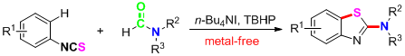 朱強(qiáng)課題組在高價(jià)碘參與或者催化的脫氫偶聯(lián)反應(yīng)用于合成含氮雜環(huán)這一研究方向,已經(jīng)取得了一些成果 (Chem. Eur. J., 2012, 18, 13964; Org. Lett., 2013, 15, 3476; Chem. Commun., 2013, 49, 7352.)。在此基礎(chǔ)上,課題組最近發(fā)展了 “一鍋法”合成2-胺基苯并噻唑類衍生物的新方法。2-胺基苯并噻唑這一核心骨架廣泛存在于天然產(chǎn)物和藥物分子中,具有廣譜的生物活性。該方法以各種一級(jí)、二級(jí)脂肪胺、芳胺甚至氨基酸酯衍生的甲酰胺為胺源,通過(guò)碘化物和過(guò)氧化物促進(jìn)的脫羰基形成相應(yīng)的胺基自由基中間體,然后對(duì)芳基異硫氰酸酯的加成以及相應(yīng)的硫自由基的環(huán)合,得到各種2-位胺基取代的苯并噻唑。該方法與傳統(tǒng)的合成這類化合物的方法相比,具有胺基類型廣泛、無(wú)過(guò)渡金屬參與等優(yōu)點(diǎn)。
