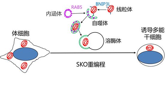 體細(xì)胞重編程技術(shù)不僅極大推動了再生醫(yī)學(xué)的發(fā)展,同時也為細(xì)胞命運(yùn)決定的機(jī)理研究提供了一個理想的體外模型。劉興國研究組以Yamanaka三因子“SKO(Sox2, Klf4, Oct4)”誘導(dǎo)的體細(xì)胞重編程模型,發(fā)現(xiàn)線粒體外膜受體BNIP3L在重編程的早期(第5-7天)發(fā)生瞬時的高表達(dá),這一受體使線粒體被自噬體識別,吞噬,然后與溶酶體融合降解。這一過程不要依賴于線粒體電勢的降低,暨單個線粒體被降解的命運(yùn)抉擇不依賴其功能良好或喪失,而依賴于外膜受體BNIP3L。進(jìn)一步的研究表明,內(nèi)涵體相關(guān)蛋白RAB5參與到了SKO重編程中線粒體發(fā)生自噬的膜結(jié)構(gòu)mitophagosome的形成。