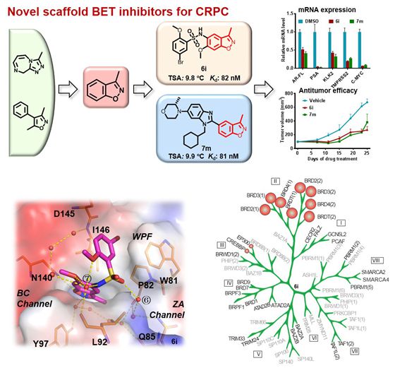 許永研究員團(tuán)隊(duì)長期致力于創(chuàng)新藥靶發(fā)現(xiàn)與確證和創(chuàng)新藥物開發(fā)研究。團(tuán)隊(duì)前期以前列腺癌耐藥等尚未滿足的臨床需求為導(dǎo)向,以計(jì)算生物學(xué)、藥物分子設(shè)計(jì)等理論策略為驅(qū)動(dòng),建立了藥物化學(xué)、化學(xué)生物學(xué)、結(jié)構(gòu)生物學(xué)等多學(xué)科交叉技術(shù)平臺(tái)。在此平臺(tái)基礎(chǔ)上,發(fā)展了苯并吲哚酮(Y02224,J. Med. Chem. 2016, 59, 1565-1579)和苯并噁嗪酮(Y08060,ACS Med. Chem. Lett. 2018, 9, 262-267)類BET溴結(jié)構(gòu)域抑制劑。近期,該團(tuán)隊(duì)又開發(fā)了一類新型苯并[d]異噁唑類BET溴結(jié)構(gòu)域抑制劑,通過分子對(duì)接和復(fù)合物晶體結(jié)構(gòu)信息為指導(dǎo),最終獲得了磺酰胺類和苯并咪唑類兩類高效的特異性BET溴結(jié)構(gòu)域抑制劑。這些化合物對(duì)前列腺癌等表現(xiàn)出良好的體內(nèi)外抗腫瘤活性。?