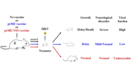 當前寨卡病毒疫苗的設計主要以包膜蛋白(envelope, E)為抗原靶標,前體膜蛋白(pre-membrane, prM)作為伴侶蛋白也常納入疫苗設計。非結(jié)構蛋白1(non-structual protein 1,NS1)雖然在寨卡病毒復制、致病中起關鍵作用,但尚無研究以其作為抗原靶標。本研究中,研究人員以復制缺陷型2型腺病毒作為載體,探索了僅攜帶E,攜帶prM、E,攜帶prM、E以及NS1的三種疫苗策略。結(jié)果發(fā)現(xiàn)含NS1抗原組份的疫苗策略不僅在母鼠中有效抵御病毒血癥,還能保護新生鼠免受寨卡病毒感染導致的體重減少、神經(jīng)癥狀等,顯著抑制病毒對新生鼠的感染。該研究表明prM、NS1的納入可顯著提升免疫保護效果,提示NS1可以做為寨卡病毒疫苗的抗原組份,值得進一步評估和開發(fā)。