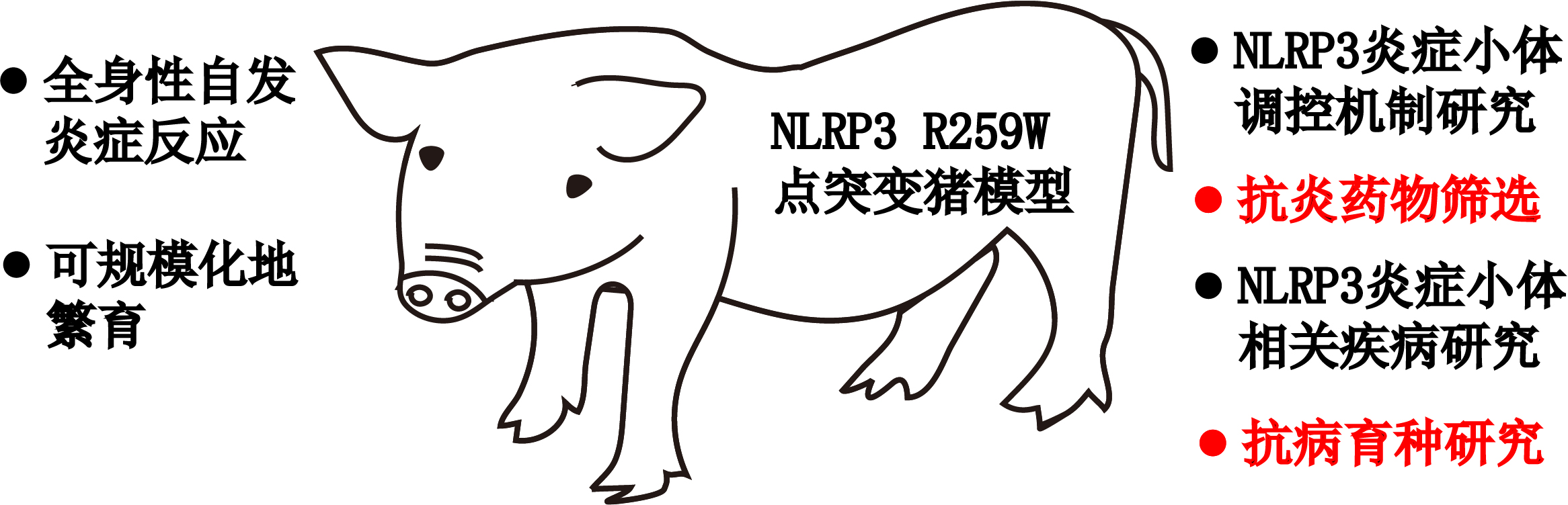 研究團(tuán)隊(duì)獲得的NLRP3炎癥小體激活增強(qiáng)豬模型,為抗炎藥物篩選提供理想的動(dòng)物模型,同時(shí)也將為一系列NLRP3炎癥小體相關(guān)疾病,如家族性周期性自身炎癥反應(yīng)、2型糖尿病、阿爾茲海默癥和動(dòng)脈粥樣硬化癥等的發(fā)生、發(fā)展機(jī)制研究提供工具豬模型;另一方面,該模型也為利用天然免疫對(duì)抗外來病毒/細(xì)菌提供研究工具,在抗病育種領(lǐng)域具有潛在的應(yīng)用價(jià)值。