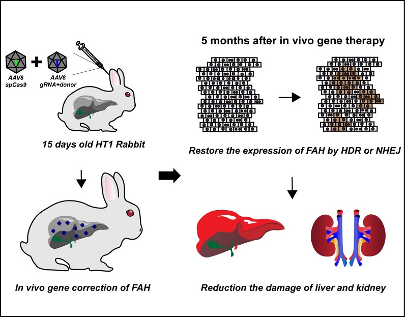 11月19日,中國(guó)科學(xué)院廣州生物醫(yī)藥與健康研究院賴良學(xué)課題組在國(guó)際學(xué)術(shù)期刊Molecular Therapy(《分子治療》)在線發(fā)表了題為“CRISPR/Cas9-mediated gene correction in newborn rabbits with hereditary tyrosinemia type I”的研究論文。該研究應(yīng)用CRISPR/Cas9系統(tǒng)成功實(shí)現(xiàn)了對(duì)Ⅰ型高酪氨酸血癥家兔模型的在體基因治療,將推進(jìn)CRISPR/Cas9系統(tǒng)介導(dǎo)的在體基因治療策略的臨床應(yīng)用。