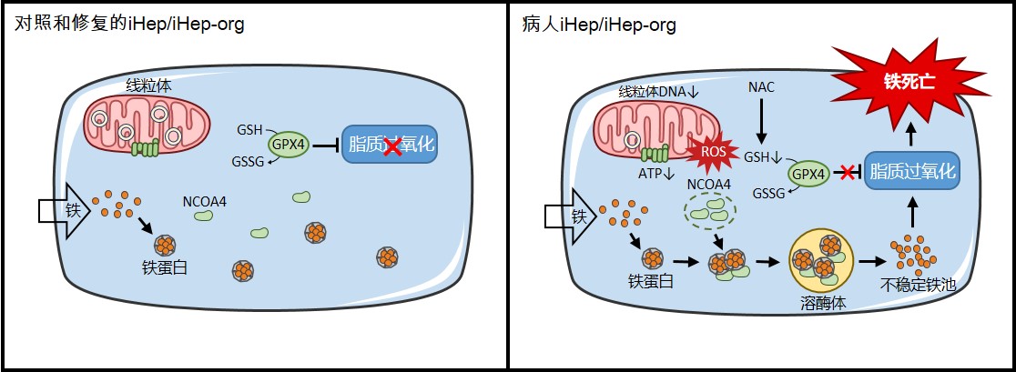 團隊發(fā)現(xiàn)病人肝細(xì)胞線粒體DNA缺失導(dǎo)致線粒體功能障礙、ATP合成減少、和活性氧(ROS)大增。病人3D肝類器官和2D肝樣細(xì)胞均對鐵沉積導(dǎo)致的鐵死亡更敏感。這一鐵死亡是線粒體與溶酶體的細(xì)胞器互作事件:首先線粒體活性氧激增及谷胱甘肽耗竭,繼而核受體共激活因子4(NCOA4)介導(dǎo)鐵蛋白在溶酶體中降解,鐵蛋白里的鐵釋放到胞質(zhì)中,引起脂質(zhì)過氧化增加,最終導(dǎo)致肝細(xì)胞鐵死亡。進一步的工作篩選出谷胱甘肽的前體—N-乙酰半胱氨酸(NAC)可以顯著抑制病人肝細(xì)胞鐵死亡。