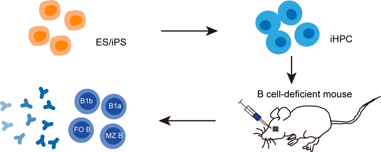 B細(xì)胞是體液免疫的關(guān)鍵細(xì)胞成分,包括固有免疫B1細(xì)胞和獲得性免疫B2細(xì)胞(MZ B, FO B)兩大類群。任何一種B細(xì)胞缺陷都會導(dǎo)致體液免疫受損,甚至導(dǎo)致嚴(yán)重感染類疾病。對于B細(xì)胞功能低下和不全相關(guān)疾病的治療,再生B細(xì)胞是一個理想的選擇。骨髓和脾臟等B細(xì)胞的發(fā)育場所有著極為復(fù)雜的微環(huán)境,多年來研究者們嘗試多種體外再生B細(xì)胞的方法,但都因為無法模擬上述復(fù)雜的B細(xì)胞發(fā)育微環(huán)境而停滯不前。王金勇課題組在多潛能干細(xì)胞(PSC)中共表達Runx1, Hoxa9, Lhx2三個轉(zhuǎn)錄因子,通過在造血發(fā)生(Hemogenesis)以及B淋系生成(lymphogenesis)階段連續(xù)作用產(chǎn)生造血種子,移植后巧妙利用B細(xì)胞先天缺失小鼠的體內(nèi)微環(huán)境,成功在小鼠體內(nèi)誘導(dǎo)出完整而成熟的B細(xì)胞譜系。