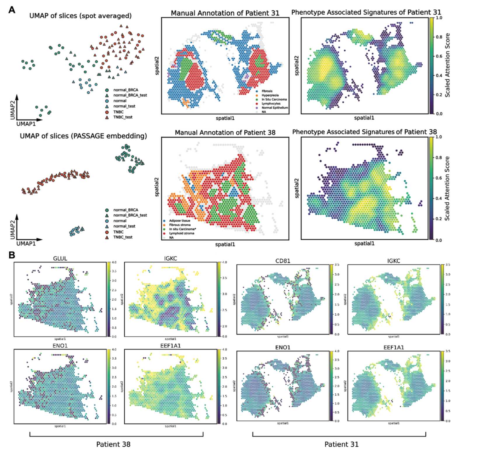 圖2 ?A) PASSAGE在乳腺癌案例中成功學(xué)習(xí)到良好的切片級表征與所識別的表型關(guān)聯(lián)空間特征?B) PASSAGE在乳腺癌案例中成功學(xué)習(xí)到與表型關(guān)聯(lián)空間特征高度關(guān)聯(lián)的基因集