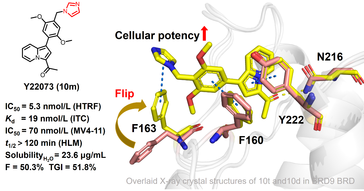 針對溴結(jié)構(gòu)域家族蛋白結(jié)構(gòu)高度相似導(dǎo)致的抑制劑選擇性難題,團(tuán)隊(duì)通過優(yōu)勢骨架化合物庫篩選、晶體結(jié)構(gòu)解析以及基于結(jié)構(gòu)的藥物設(shè)計(jì),成功開發(fā)出可用于AML治療的新型BRD9選擇性溴結(jié)構(gòu)域抑制劑Y22073。研究人員從基于結(jié)構(gòu)活性關(guān)系(SAR)的優(yōu)化策略中發(fā)現(xiàn)了咪唑類化合物具有卓越的體外抗增殖活性。合作團(tuán)隊(duì)通過X射線晶體結(jié)構(gòu)解析(分辨率最高達(dá)1.78 ?)精準(zhǔn)捕捉到BRD9的ZA通道存在一個(gè)獨(dú)特的“可調(diào)控開關(guān)”——Phe163翻轉(zhuǎn)開關(guān)。抑制劑中關(guān)鍵的咪唑藥效基團(tuán)能夠誘導(dǎo)BRD9蛋白的Phe163殘基翻轉(zhuǎn)并與其形成穩(wěn)定的π-π相互作用。然而,其他溴結(jié)構(gòu)域(如BRD7、BRD4、CECR2)中對應(yīng)位置的殘基無法與咪唑基形成有效相互作用,直接證明了該機(jī)制的特異性。這一分子層面的突破性發(fā)現(xiàn)不僅顯著提升了化合物的體外活性,也使得Y22073成為首個(gè)在AML模型中展現(xiàn)明確疾病表型干預(yù)能力的BRD9抑制劑。研究團(tuán)隊(duì)還創(chuàng)新性地采用該修飾策略對現(xiàn)有BRD9抑制劑進(jìn)行結(jié)構(gòu)改造,結(jié)果表明,經(jīng)此策略修飾后的化合物在體外的活性顯著提升,進(jìn)一步證實(shí)咪唑基團(tuán)可通過調(diào)控獨(dú)特的Phe163開關(guān),在提高活性方面發(fā)揮關(guān)鍵作用。Y22073表現(xiàn)出良好的溴結(jié)構(gòu)域選擇性、代謝穩(wěn)定性、溶解性并兼具理想的藥代動力學(xué)特性,在MV4-11異種移植小鼠模型中表現(xiàn)出顯著的口服抗腫瘤效果,且無明顯毒性。綜合其優(yōu)異的體外活性、體內(nèi)療效及成藥性特征,Y22073作為具有First-in-Class潛力的BRD9溴結(jié)構(gòu)域選擇性抑制劑,為急性髓系白血病的靶向治療提供了極具臨床轉(zhuǎn)化價(jià)值的新型候選藥物。