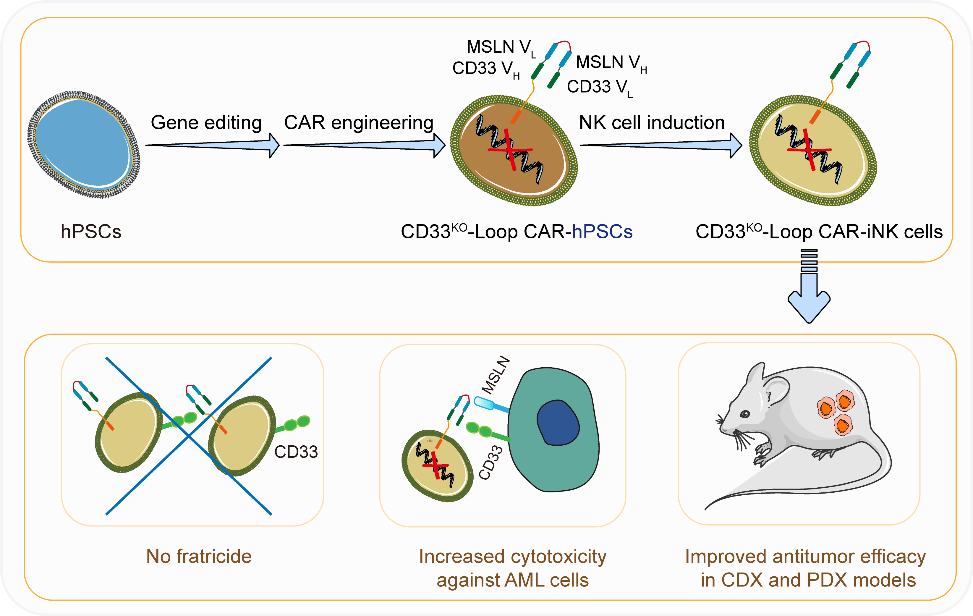 圖1 CD33KO-CD33-MSLN Loop CAR-iNK細胞精準靶向治療急性髓系白血病