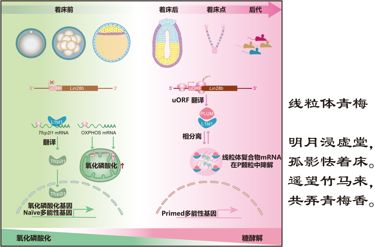 團(tuán)隊(duì)利用核糖體測(cè)序技術(shù)發(fā)現(xiàn)在Primed多能干細(xì)胞中,Lin28b的5’UTR區(qū)特異性翻譯產(chǎn)生微蛋白PLUM,且呈胞質(zhì)點(diǎn)狀聚集分布。通過構(gòu)建基因敲除模型,研究證實(shí)PLUM缺失會(huì)使 Primed多能干細(xì)胞幾乎以100%效率轉(zhuǎn)變?yōu)镹a?ve狀態(tài),并導(dǎo)致胚胎著床顯著受損,表明PLUM 對(duì)多能干細(xì)胞命運(yùn)具有決定性作用。機(jī)制研究表明,PLUM與RNA結(jié)合蛋白L1td1直接互作,調(diào)控其胞質(zhì)凝聚體和相分離,進(jìn)而改變其結(jié)合的下游RNA,提高Tfcp2l1、Zfp42?等Na?ve多能性基因的RNA 穩(wěn)定性提高,激活氧化磷酸化基因表達(dá)。同時(shí),PLUM缺失也破壞了細(xì)胞中負(fù)責(zé) mRNA 降解的P顆粒,其中富集編碼線粒體復(fù)合物I和V的基因mRNA,提示PLUM可能通過P顆粒組裝調(diào)控線粒體功能。