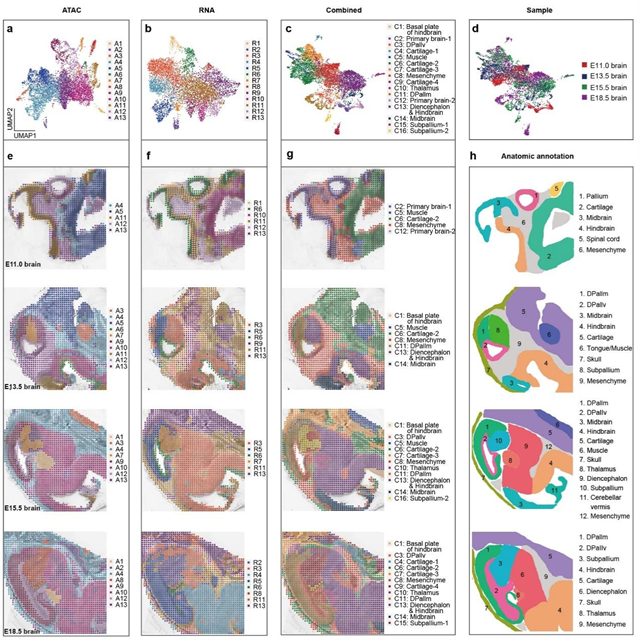 圖2. E11.0, E13.5, E15.5 和E18.5小鼠腦的空間基因表達、染色質可及性以及結合二者的空間圖譜