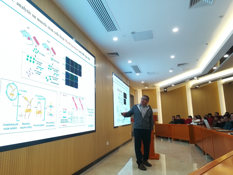 本次報告朱大海教授首先介紹了生肌調(diào)節(jié)因子(MRFs)之一的MyoD在骨骼肌增殖和分化調(diào)控起重要作用。通過高通量測序等一系列的實驗來證明MyoD做為經(jīng)典譜系轉(zhuǎn)錄因子,不僅從功能上調(diào)控成肌細(xì)胞的增殖與分化,更重要的是MyoD從結(jié)構(gòu)上扮演著“Genome Organizer”的角色來調(diào)節(jié)肌肉細(xì)胞命運的決定。隨后,朱大海教授又從衰老方面為我們講解骨骼肌減少癥的分子機(jī)制,著重研究了G-CSF和PAX7在肌衛(wèi)星細(xì)胞的維持與再生功能中發(fā)揮的作用。最后,朱大海教授從罕見病肌肉營養(yǎng)不良癥(DMD)出發(fā),通過Mdx基因突變小鼠模型,找到一個命名為“002”的化合物,該化合物通過靶向EGF受體在體內(nèi)和體外實驗中共同證明了“002”可以改善Mdx小鼠的骨骼肌發(fā)育。同時,朱大海教授為我們詳細(xì)講解了“002”的發(fā)現(xiàn)之旅,從2005年至今,該項研究尚未發(fā)表。報告結(jié)束后,大家踴躍提問,朱大海教授就在場研究人員及學(xué)生提出的一系列問題給予了詳細(xì)的解答,整個報告持續(xù)了2個多小時。