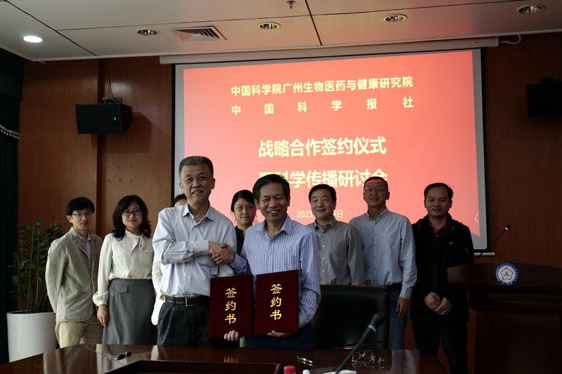 4月9日,中國科學(xué)院廣州生物醫(yī)藥與健康研究院(簡稱廣州健康院)與中國科學(xué)報(bào)社戰(zhàn)略合作協(xié)議簽約儀式暨科學(xué)傳播研討會在廣州健康院第一會議室舉行。廣州健康院院長陳新文、中國科學(xué)報(bào)社黨委書記劉峰松代表雙方簽訂協(xié)議。會議由廣州健康院黨委副書記、紀(jì)委書記侯紅明主持。
